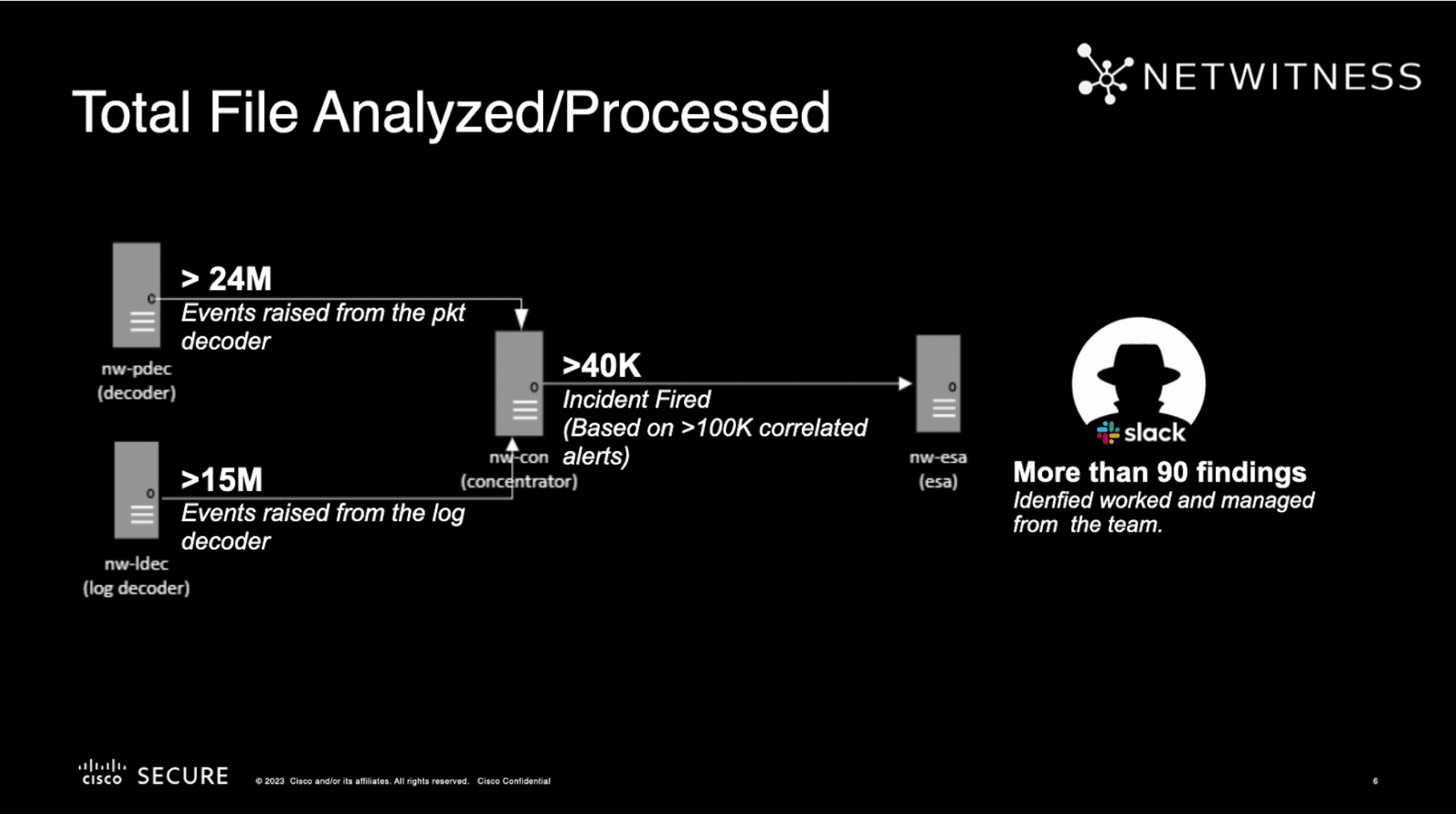 Additionally, of the total files analyzed and processed, 40,000 incidents were fired, resulting in more than 90 findings identified, worked, and managed by the team.