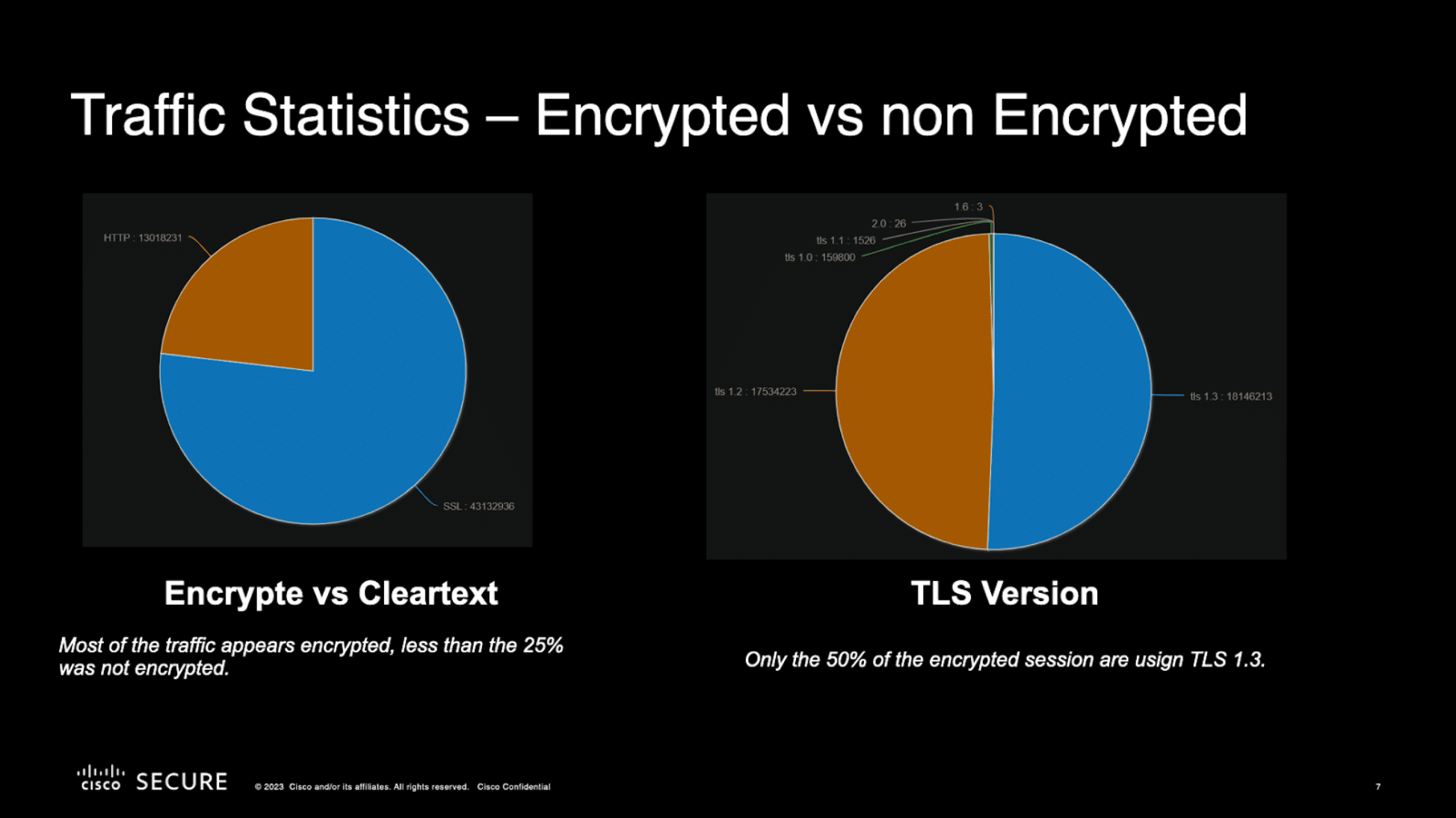 Surprisingly, about 25% of network traffic was unencrypted, and only 50% of the encrypted sessions used TLS 1.3.