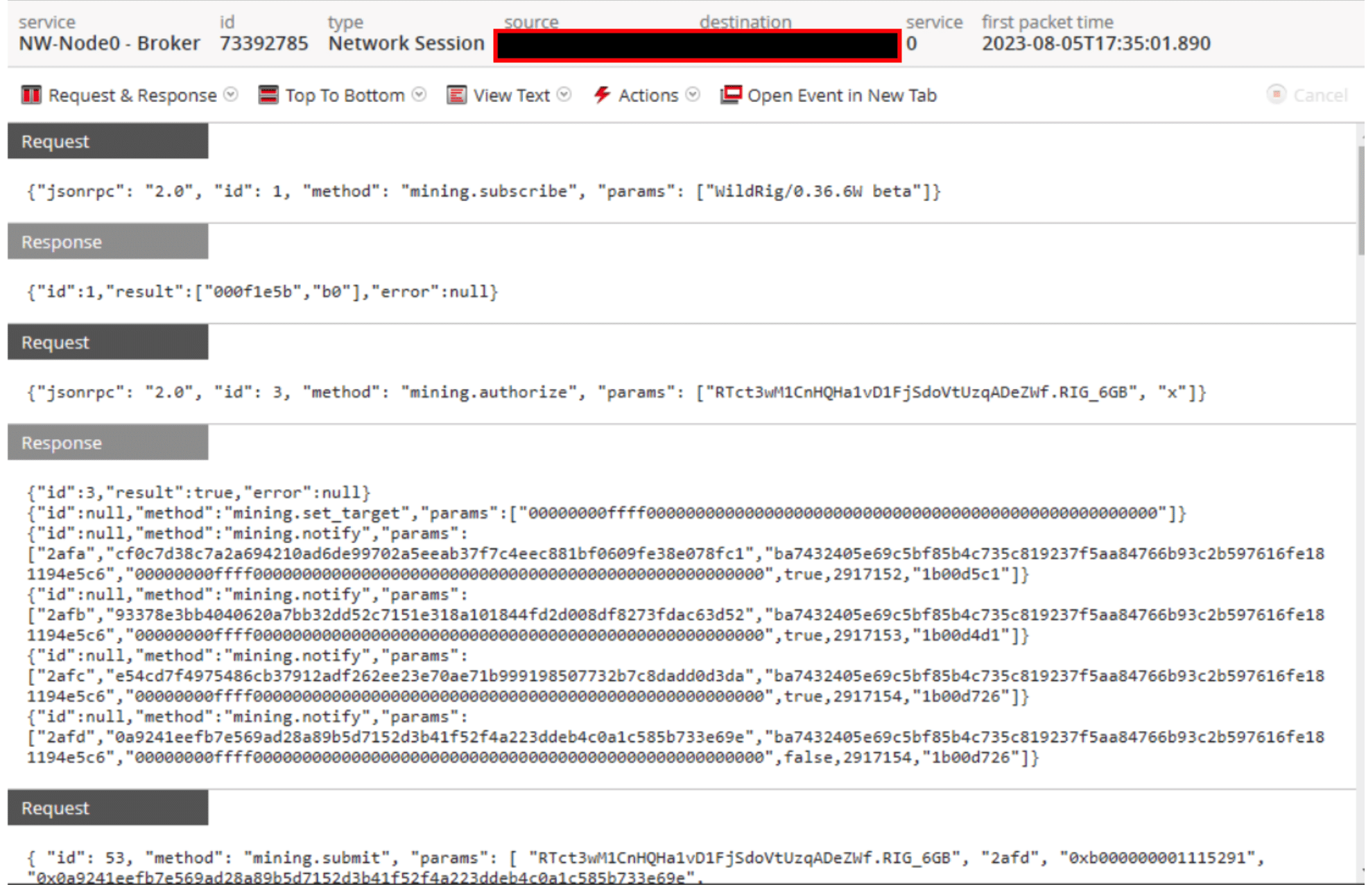 For example, during the conference, NetWitness discovered that one attendee was using a machine on the network that was already infected with malware before arriving at the conference. An example of an identified crypto miner is shown below.