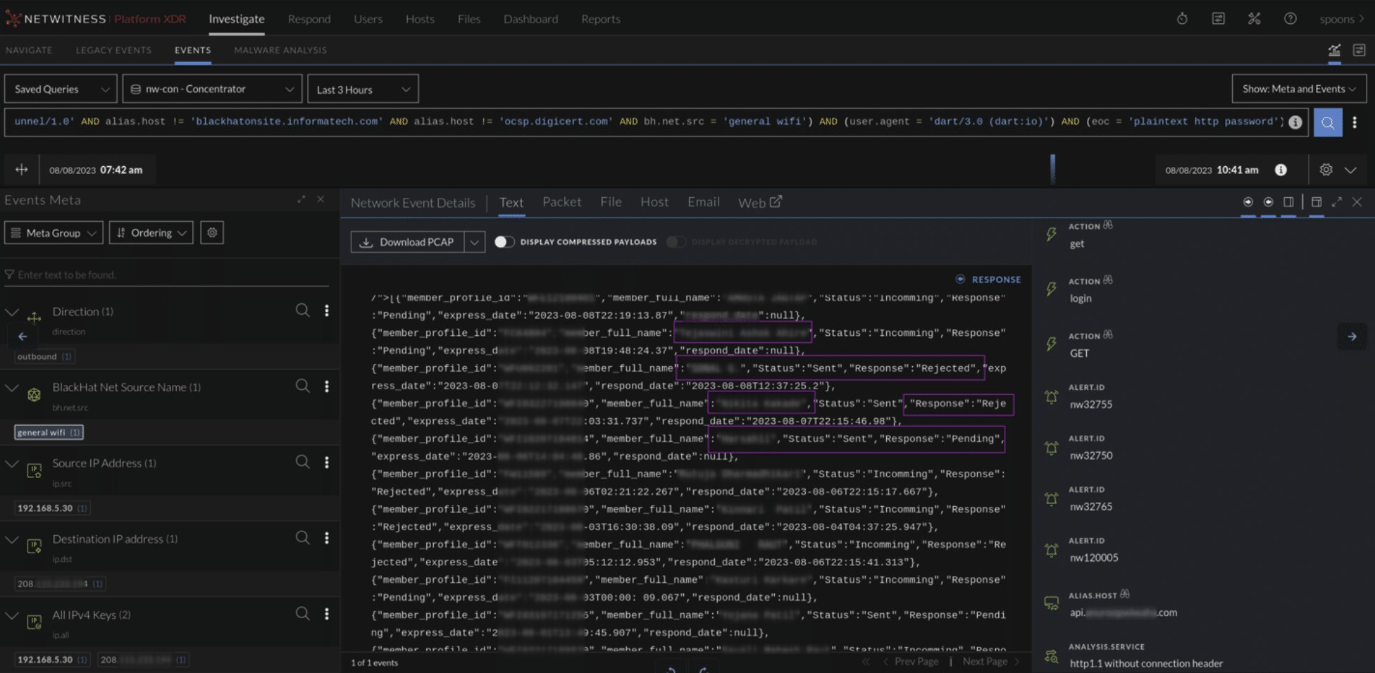 Throughout the conference, NetWitness distinguished between malicious activities and misconfigurations. For instance, we identified devices already infected with malware and tracked down owners for notification. We also pinpointed misconfigurations in various applications, including those failing to encrypt sensitive data like PII or GPS coordinates. In severe data leaks or network abuse cases, attendees were invited to the NOC for a friendly heads-up through a captive portal.