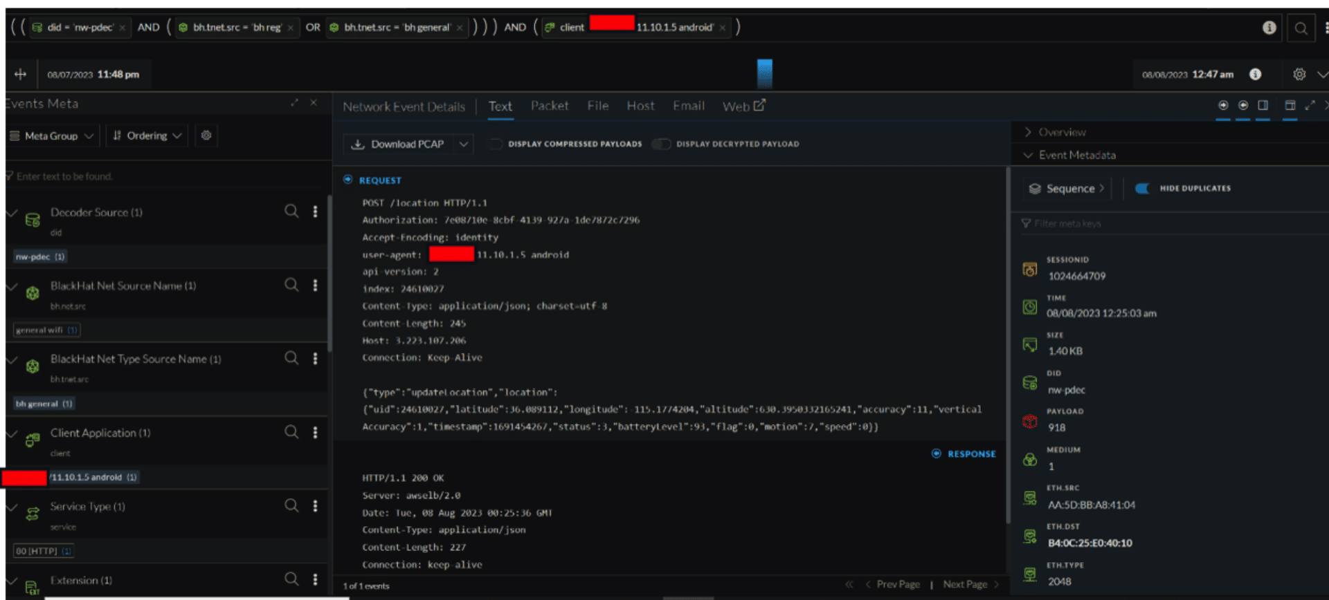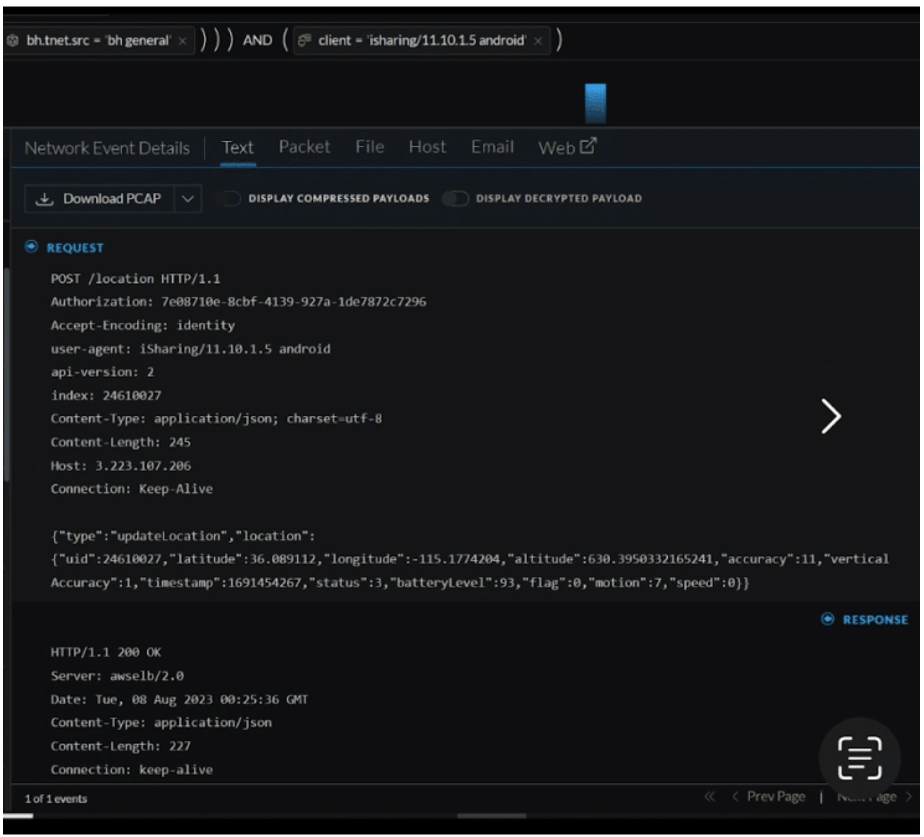 The most critical misconfiguration we detected involved a child safety location-sharing application. This app, designed for parental monitoring, was transmitting sensitive information, such as precise coordinates, direction, speed, and battery health, without proper encryption, directly to AWS servers. Utilizing the unique capabilities of NetWitness, we extracted the client key of the app, granting us further insights into all related traffic.