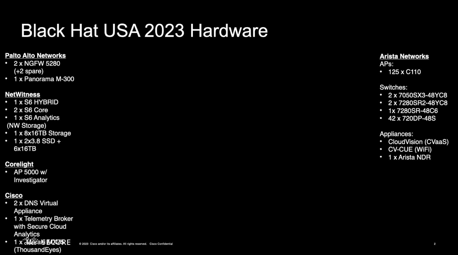 Every year, the NOC partners are selected by Black Hat to provide a high security, high availability network to users and protect that network from potential attacks. This year’s partners delivering from Las Vegas included Arista, Cisco, Corelight, Lumen, NetWitness, and Palo Alto Networks.
