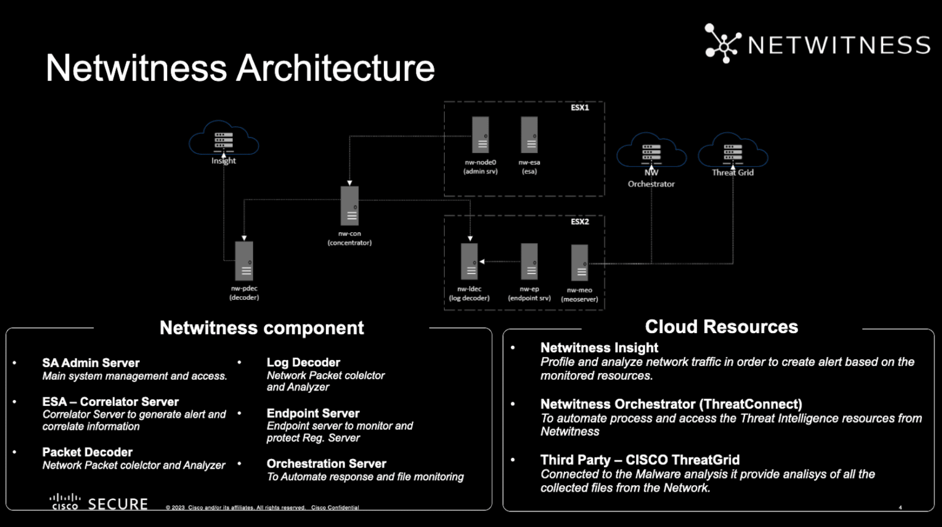 - NetWitness Insight: Profiled and analyzed network traffic, forming the basis for generating timely alerts.