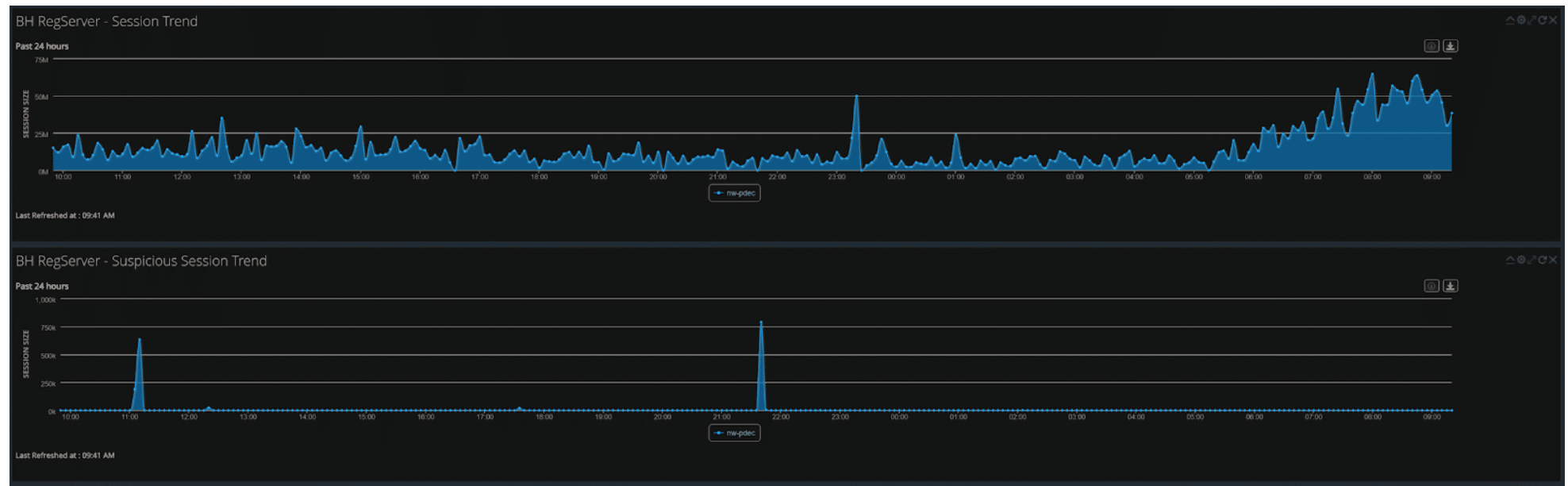 NetWitness monitored traffic in and out of the networks, focusing on the Registration network. For example, as shown in the graphic below, the sudden uptick in traffic on the Registration network indicates the beginning of the conference.