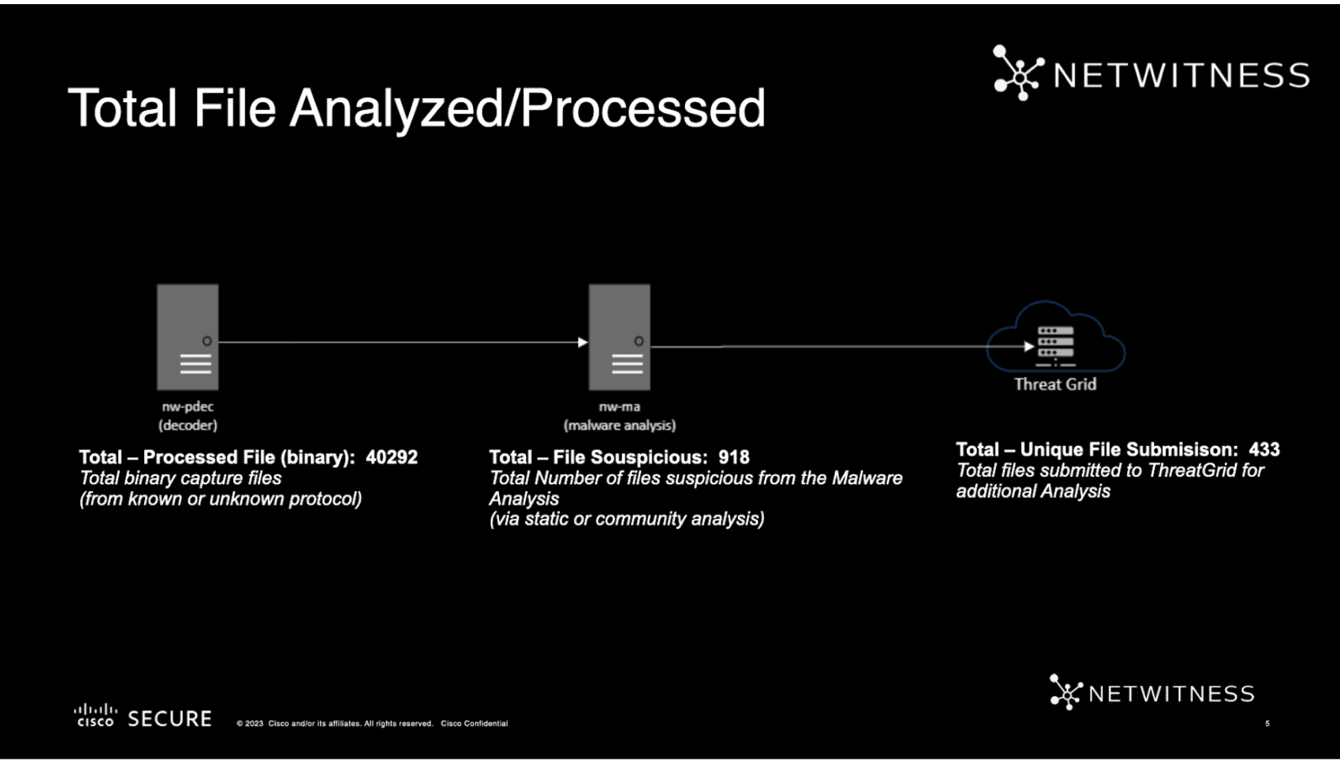 Overall, NetWitness saw 40,292 unique files. Of those files, 918 were suspicious, and 433 unique files were submitted to Cisco Threat Great for further analysis.